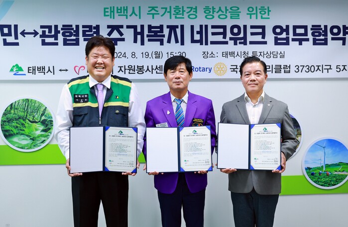[로컬세계=박상진 기자]강원 태백시는 지난 19일 시 투자상담실에서 태백시자원봉사센터, 국제로타리클럽 3730지구 5지역과 주거환경 향상을 위한 ‘민·관 협력 주거복지 네트워크 업무협약’을 체결했다고 20일 밝혔다.