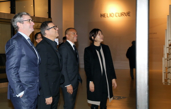 ▲ 루크 동커볼케 현대디자인센터장, 피터 슈라이어 현대·기아차 디자인 총괄 사장, 맨프레드 피츠제럴드 제네시 스 전략담당 전무(사진 왼쪽부터)가 지난 6일 '움직임의 미학’전시회에서 현대자동차 관계자들과 함께 작품을 관 람하고 있다. <사진제공=현대기아차> |