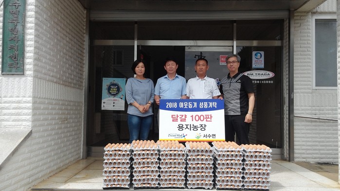 송병선 서수면장은 “경기불황에도 적지 않은 계란을 기탁해 주신 용지농장에 감사드리며 전달받은 계란은 지역 내 불우이웃과 경로당 33개소에 전달해 사랑과 정이 넘치는 지역사회를 만들도록 하겠다”고 말했다.