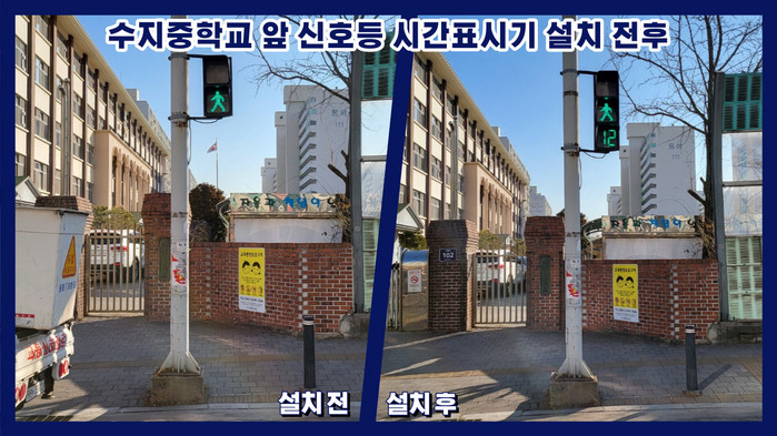 | ▲수지중학교 앞 신호등 시간표시기 설치 전후 모습. 용인시 제공 |