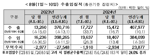 관세청은 12일, 8월 1일~10일 기간의 수출입 현황을 발표했다.