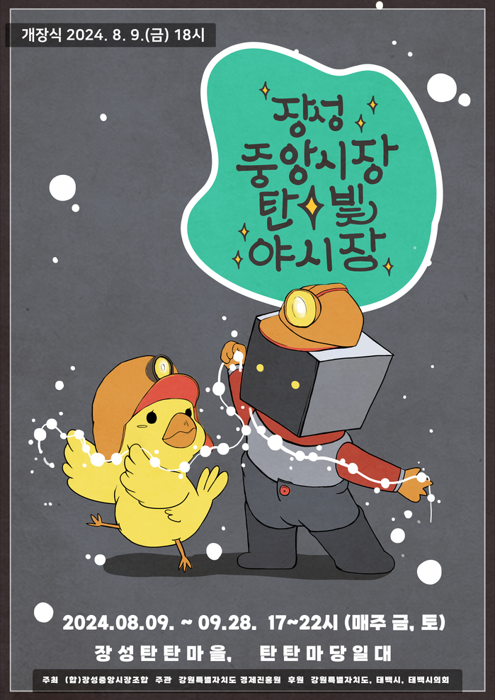 [로컬세계=박상진 기자]강원 태백시는 오는 9일부터 9월 28일까지 장성중앙시장과 장성탄탄마당에서 흑면장군(광부) 이야기를 모티브로 한 ‘장성중앙시장 탄◇빛 야시장’을 운영한다고 8일 밝혔다.