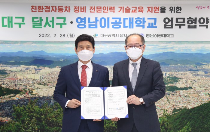 [로컬세계 박세환 기자]대구 달서구(구청장 이태훈)는 지난달 28일 구청 5층 회의실에서 영남이공대학교(총장 이재용)와 친환경자동차 정비 전문인력 기술교육 지원을 위한 업무협약을 체결했다고 3일 밝혔다.