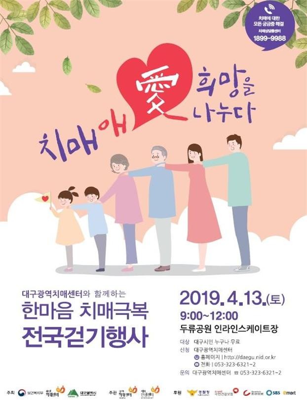 한편 지난해 한마음 치매극복 전국걷기행사에는 비가 오는 날씨에도 불구하고 3000여명이 참가했으며 치매관련사업 안내 부스, 치매예방운동법 시연 및 ‘치매체크 앱’을 활용한 치매선별검사 등의 행사가 진행됐다.