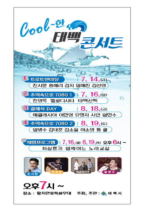 다음달 18일에는 에클레시아·샤인·함민수 등이 출연해 클래식과 아리랑의 만남 등 Cool∼한 태백 콘서트에서만 함께 할 수 있는 ‘클래식 Day’가 이어진다. 19일에는 임병수·김대훈·김소율·허소영 등이 출연해 어쿠스틱 밴드의 공연과 추억의 통기타 라이브 공연인 ‘7080콘서트2’가 공연된다.