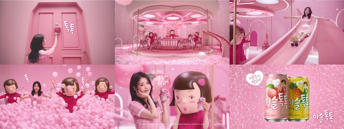 이번 광고는 핑크빛 이슬톡톡 테마파크를 콘셉트로 진행했다. 이슬톡톡을 마셨을 때의 기분을 테마파크에서의 즐거움으로 표현했다.