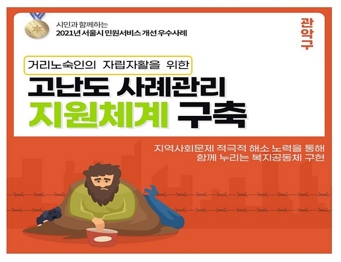 [로컬세계 임종환 기자]서울 관악구(구청장 박준희)의 ‘거리노숙인 자립·자활을 위한 고난도 사례관리 지원체계 구축’ 사업이 2021년 서울시 민원서비스 개선 우수사례 우수상으로 선정되는 영예를 안았다.
