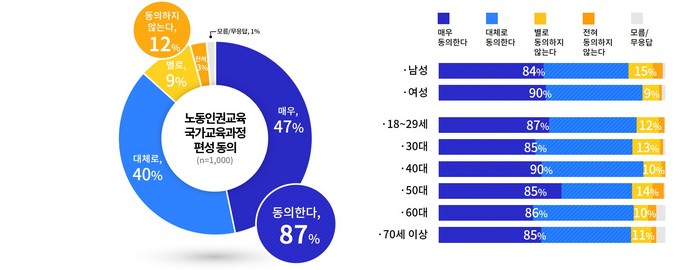 이와 관련, 이번 여론조사에서 도민 87%는 노동인권교육의 정규 교육과정 편성에 ‘동의한다’고 답했다. 정규 교육과정 편성 동의율은 성별(남 84%, 여 90%), 세대별(최저 30·50·70대 이상 85%, 최고 40대 90%)로 고르게 높았다. 또한 도민 89%가 도의 청소년 노동인권교육 관련 교육부 건의안에 ‘잘했다’고 긍정적으로 평가했다.
