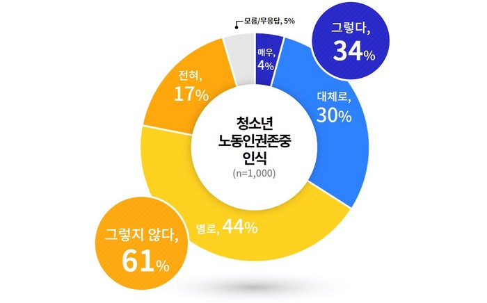 이어 우리 사회에서 청소년 노동인권이 존중되고 있느냐는 물음에 도민 61%가 ‘그렇지 않다’고 답하며 상당수 도민이 열악한 청소년 노동실태에 공감하는 것으로 나타났다.