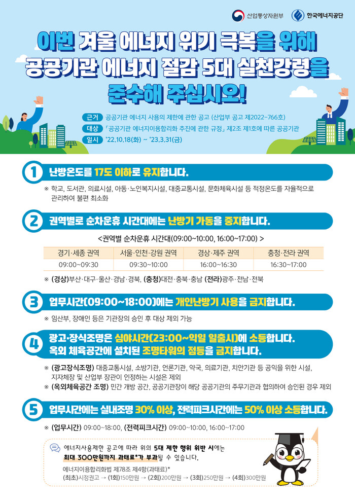 5대 실천 강령에는 ▲난방온도를 17도 이하로 유지 ▲순차운휴 시간대(09:00~09:30) 난방기 가동 중지 ▲업무시간에 개인난방기 사용 금지 ▲ 심야시간에 경관 조명 소등 및 조명타워 소등 ▲업무시간에 실대조명 30%이상, 전력피크시간에는 50%이상 소등이 있다.