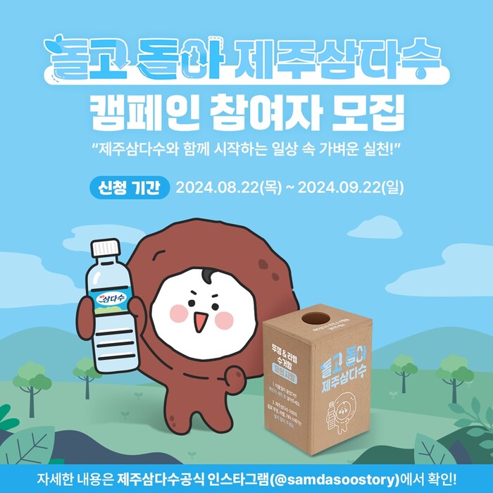 제주삼다수 공식 SNS를 통해 오는 9월 22일까지 선착순 700명의 참가자를 모집하며, 개별 발송되는 수거함에 삼다수 뚜껑과 라벨을 각 30개 이상 수집하면 된다. 회수된 뚜껑과 라벨은 키링, 마그넷 등 제주삼다수 친환경 굿즈로 재탄생돼 참가자에게 다시 전달된다.