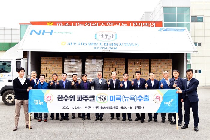 시는 8일 김경일 시장을 비롯해 파주시농협쌀조합공동법인 대표, 권욱민 NH농협 파주시지부장, 각 지역농협조합장, 한국쌀전업농 파주시연합회장이 참석한 가운데 파주시농협쌀조합공동사업법인(RPC) 광장에서 기념행사를 열고 파주쌀 수출을 축하했다.