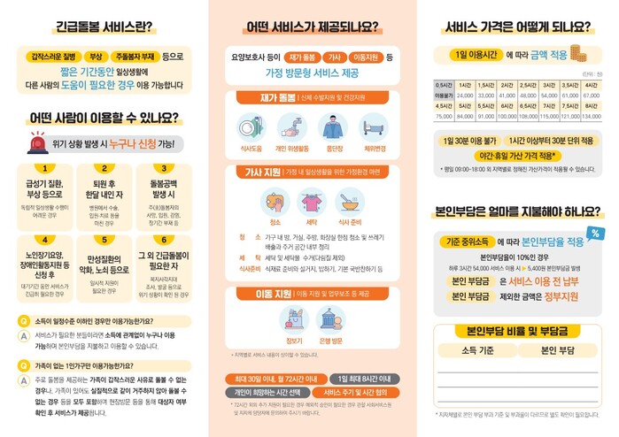 가정방문을 통해 긴급성과 돌봄 필요성 등 자격 요건 확인 후 최대 30일 이내 72시간 범위에서 요양보호사 등의 전문 인력이 가정으로 방문해 돌봄서비스를 지원할 예정이다.