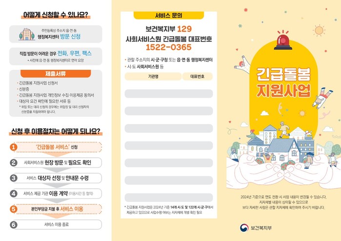 긴급돌봄서비스는 주민등록상 주소지의 읍·면 찾아가는 보건복지팀에서 신청할 수 있다.
