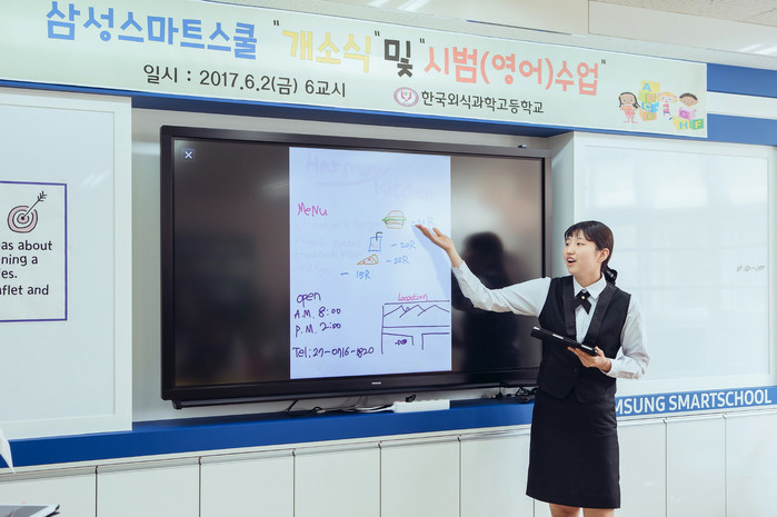 ▲지난 6월, 삼성전자에서 '스마트 스쿨'을 지원하는 한국외식과학고등학교 학생이 태블릿과 전자칠판을 통해 발표 수업을 하고 있다.(삼성전자 제공) |