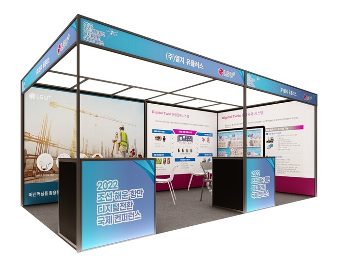 ▲LG유플러스가 '2022 조선·해운·항만 디지털전환 국제 컨퍼런스'에 참가해 자사의 스마트항만·스마트팩토리 등 솔루션을 소개한다. 사진은 LG유플러스의 부스 조감도. |