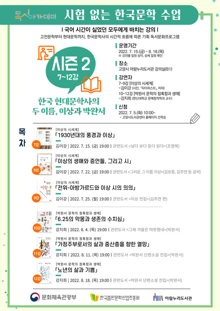 [로컬세계 = 이영원 기자]경기 고양시(이동환 시장) 아람누리도서관이 오는 15일부터 '시험 없는 한국문학 수업' 시즌2  ‘한국 현대문학사의 두 이름, 이상과 박완서’를 운영한다.
