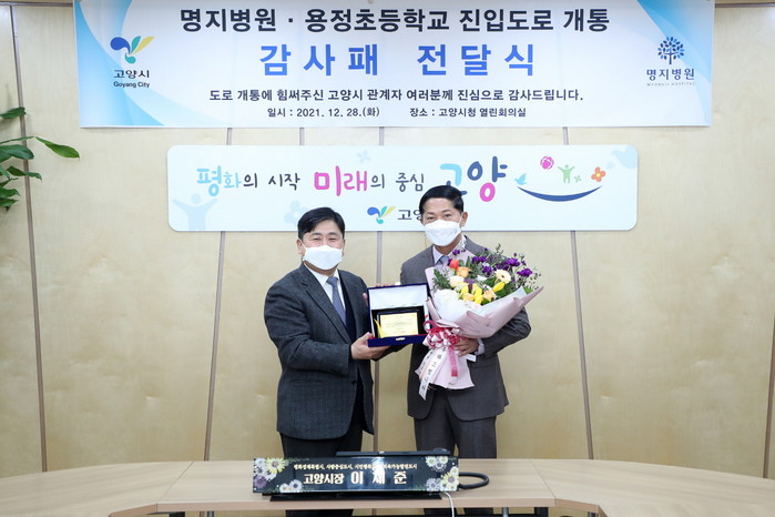 [로컬세계 강영한 기자]경기 고양시(시장 이재준)가 호국로에서 명지병원을 직접 연결하는 진입도로를 개설한 것에 대한 감사 표시로 명지병원으로부터 감사패를 전달받고 지난 28일 전달식을 개최했다.