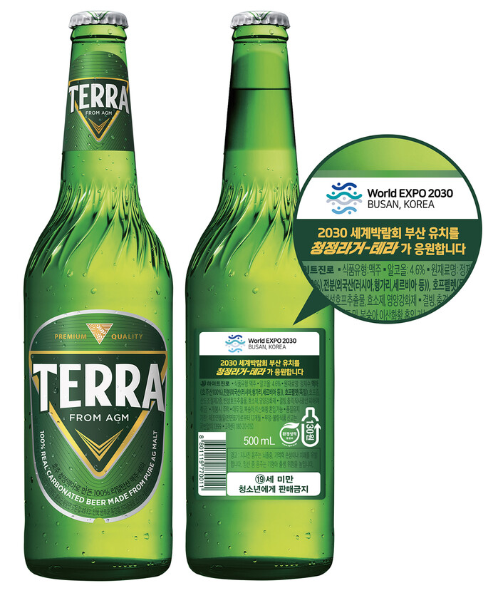 지난해 5월 24일 하이트진로와 부산시는 2030부산엑스포 유치 홍보와 범시민 유치 열기 확산을 위한 업무협약(MOU)을 체결한 바 있다. 이후 하이트진로는 전 세계 No.1 소주 참이슬 제품에 주기적으로 부산 엑스포 유치 응원 문구를 넣은 라벨을 붙여 판매 중이다. 참이슬에 이어 하이트진로의 대표 맥주 브랜드인 테라를 활용, 부산의엑스포 유치를 홍보할 예정이다. 또한, 부산의 주요 지역에엑스포 유치 관련 홍보물을 부착해 부산 시민과 부산시를 찾는 관광객을 대상으로 홍보 활동을 펼친다.