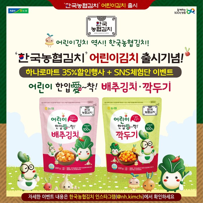 또 오는 12일부터 24일까지 한국농협김치 공식 인스타그램에서 육아맘 등을 대상으로 SNS 체험단 100명을 모집한다. 체험단은 초성퀴즈 맞추기 등 미션 수행 방식으로 응모할 수 있으며, 최종 선정된 체험단에게는 ▲어린이 김치 한입애(愛)착 배추김치300g×1개입 ▲어린이 한입애(愛)착 깍두기300g×1개입 ▲어린이 한입애(愛)착 백김치 300g×1개입 ▲볶음김치 80g×5개입으로 구성된 한국농협김치 신제품을 체험상품으로 제공하고, 한국농협김치 캐릭터로 만든 어린이 김치 스티커(11종) 1매를 선물로 증정하며, 체험단 100명 중 우수후기를 작성한 20명에게는 한국농협김치 보냉백을 추가 제공한다. 자세한 내용은 인스타그램을 통해 확인할 수 있다.