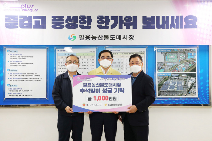 허 시장은 추석을 맞아 어려운 이웃을 돕기 위한 팔용농산물도매시장 청과법인(㈜창원청과시장, 농협창원공판장)의 1000만원 성금기탁증서를 전달받고, 힘든 여건에도 소외된 이웃을 돕고자 사랑 나눔을 실천하는 도매시장법인에게 감사 마음을 전했다.