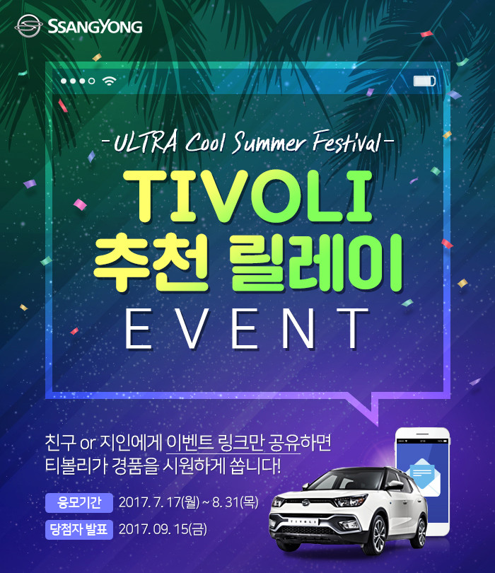 많은 사람들과 신차 구매의 기쁨을 함께 하는 ‘티볼리 추천 릴레이 이벤트’도 진행된다. 티볼리 출시 이후 모든 구매고객에게 발송된 문자메시지(이벤트 링크 포함)를 지인에게 전달함으로써 티볼리를 추천하면 이를 받은 사람이 이벤트 링크에 접속하여 응모할 수 있다. 최초 추천고객과 최초 응모고객에게 각각 모바일 편의점 쿠폰(1천원)을 증정한다.