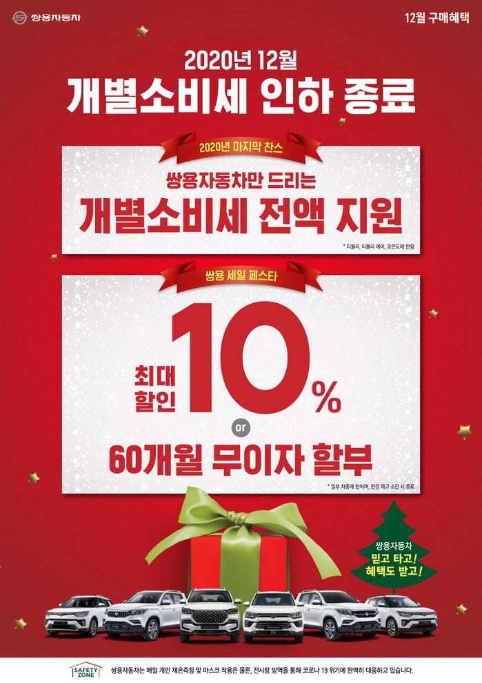 쌍용자동차가 12월 차종에 따라 최대 10% 할인(일부 모델)하는 ‘Merry Ssangyong 세일페스타(이하 세일페스타)’를 시행한다. 세일페스타 미해당 모델에도 개별소비세 전액에 해당하는 최대 5% 할인 등 다양한 구매혜택을 제공한다고 1일 밝혔다.