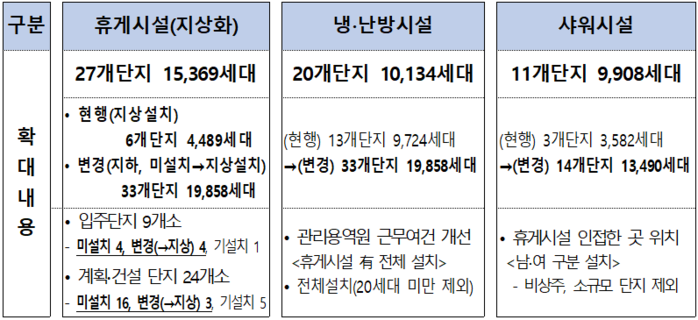 이에 따라 입주가 끝난 9개 단지 가운데 휴게공간이 설치돼 있지 않은 4개단지와 지하에 휴게공간이 있는 4개 단지 등 8개 단지가 새롭게 공사를 시작하게 된다.