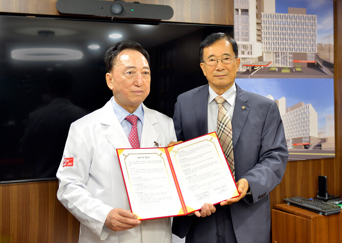 ▲19일 김철수 에이치플러스 양지병원 이사장과 대한노인회 미주총연합회 정기영 회장(우) 이 진료 및 건강검진 등 포괄적 의료협약을 체결했다. |