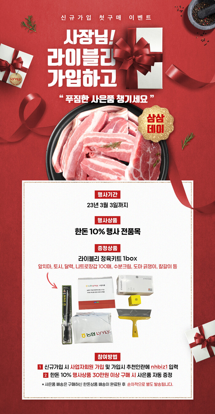 홈페이지에 접속하여 행사 상품 상세화면을 통해 10% 할인쿠폰을 다운 받으면 할인된 가격에 구매할 수 있으며, 또한 신규 가입 후 행사상품을 30만원 이상 구매한 사업자몰 회원에게는 라이블리 정육키트를 사은품으로 증정한다.