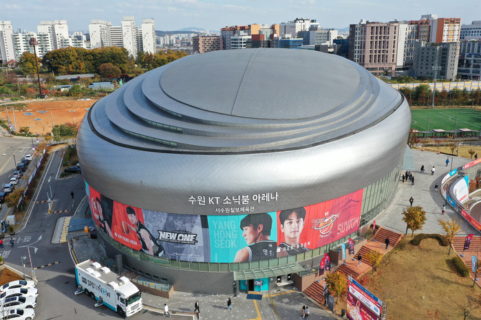 | ▲수원시로 연고지를 이전한 수원KT소닉붐의 홈경기장 간판이 수원KT소닉붐아레나로 변경된 모습. |