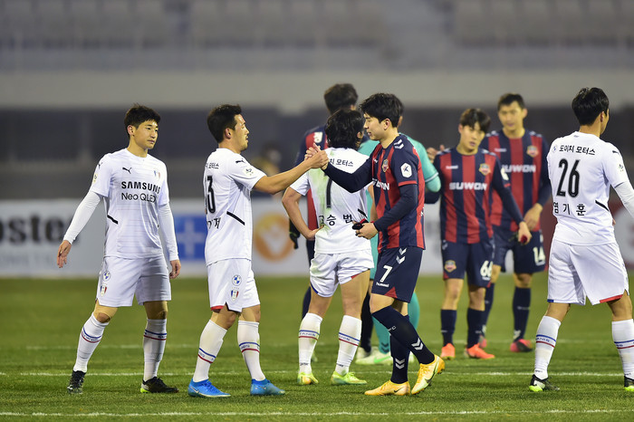 | ▲지난 3월 10일 수원시에 연고를 둔 프로축구 수원삼성블루윙즈와 수원FC가 수원종합운동장에서 경기 후 서로 인사를 나누고 있다. |