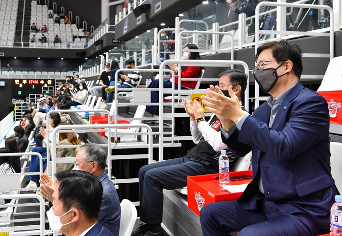 | ▲지난 7일 염태영 수원시장이 수원KT소닉붐아레나에서 펼쳐진 KT소닉붐의 홈경기에서 시투 후 경기를 직관하며 응원하고 있다. 수원시 제공 |