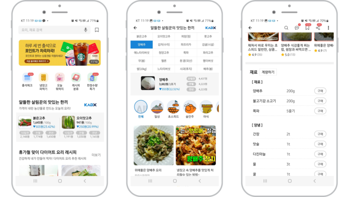 한국농수산식품유통공사(사장 김춘진) 농식품 빅데이터 거래소 카덱스(KADX, Korea Agrofood Data eXchange)가 민간 플랫폼인 ‘만개의레시피’와 융합하여 10일 전과 비교해 저렴해진 농산물로 요리가 가능한 인기 레시피 추천 서비스를 선보인다.