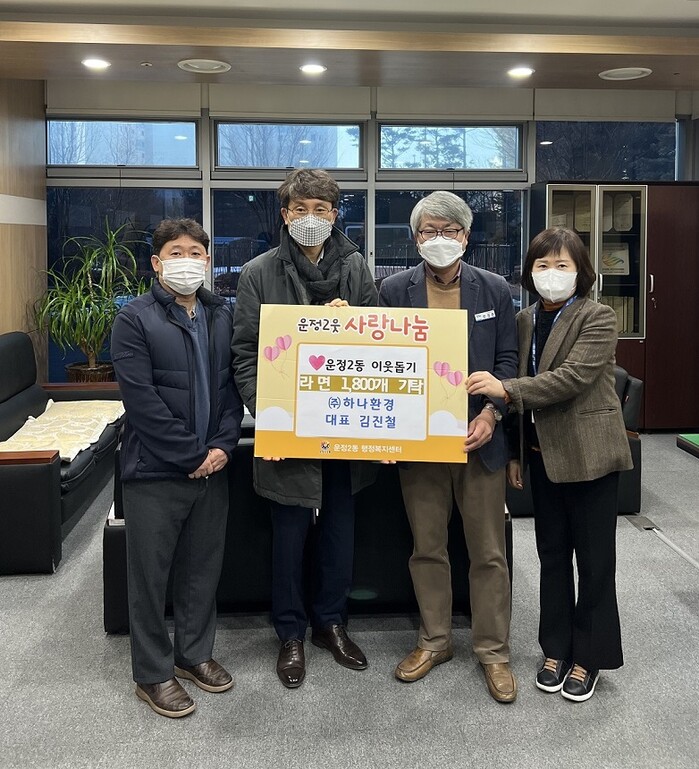 이날 ㈜하나환경은 운정행정복지센터에 방문해 어려운 이웃을 위해 써달라며 라면 1,800개를 기부했다.