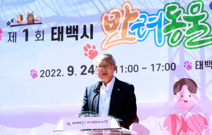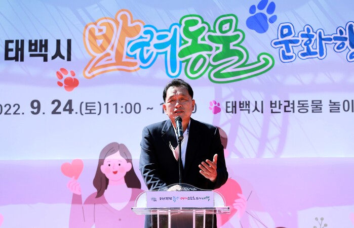 ▲ 24일 태백시 반려동물놀이터에서 열린 반려동물 놀이터 개장식에서 한동구 부시장이 기념사를 하고 있다. |