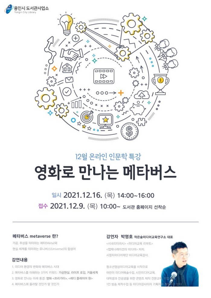 [로컬세계 김병민 기자]경기 용인시 도서관사업소가 9일부터 온라인 인문학 특강 ‘영화로 만나는 메타버스’의 참가자를 모집한다.