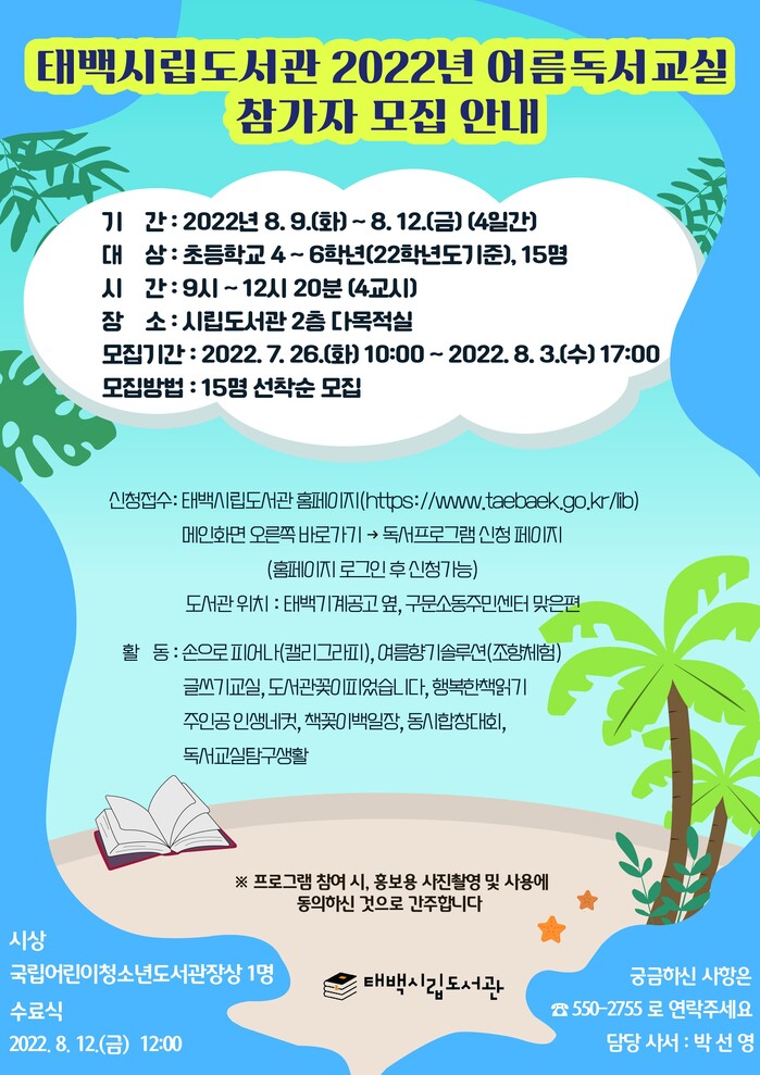 시 관계자는 “어린이들이 다양한 독서 활동을 통해 사고력과 상상력을 키우고, 여름방학을 알차게 보낼 수 있기를 바란다”며 “ 코로나 19 예방수칙을 준수해 안전하게 진행하도록 최선을 다하겠다”라고 전했다.