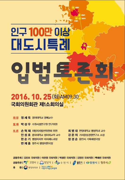 25일 오전 9시 30분 국회의원회관에서 열리는 토론회는 수원을 지역구로 두고 있는 이찬열·백혜련‧김영진·박광온·김진표 의원이 공동 주최하고, 수원, 고양, 성남, 용인, 창원, 청주 등 인구가 100만 명 이상이거나 100만 명 돌파를 앞에 두고 있는 6개 도시가 공동주관한다.