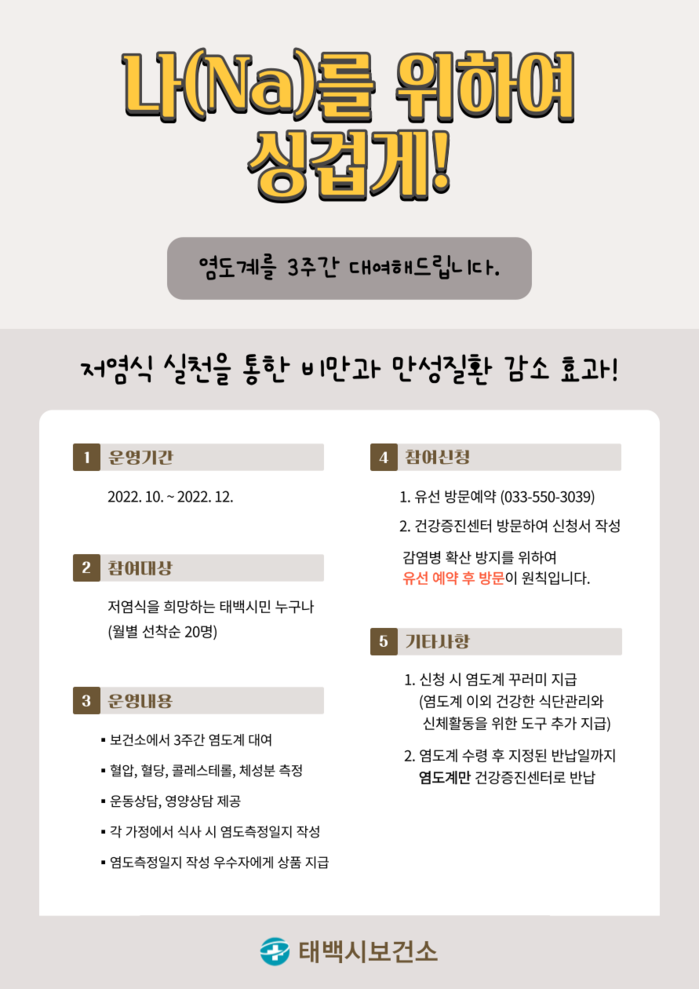 참여 희망자는 전화로 사전 예약후 건강증진센터를 방문해 기초검사(체성분·혈압 등), 저염식 실천을 위한 1:1 맞춤형 영양 상담, 염도계 사용법 및 염도측정일지 작성법을 안내 받은 후 3주간 염도계를 대여해 사용할 수 있다.