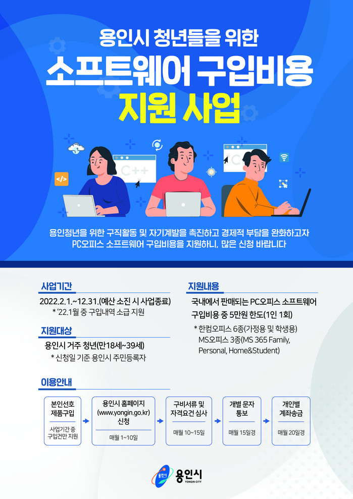 [로컬세계 김병민 기자]용인시가 관내 청년들의 경제적 부담을 덜어주기 위해 전국 지자체 최초로 소프트웨어 구입 비용을 지원한다.