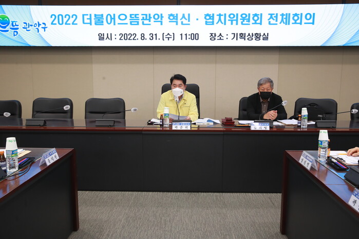 [로컬세계 = 임종환 기자]서울 관악구는 지난달 31일 구정 자문기구인 ‘더불어으뜸관악 혁신·협치위원회’ 전체회의를 개최하고, 민선 8기 4년간의 구정 운영 방향인 ‘구정운영 4개년 계획안’에 대해 논의했다고 5일 밝혔다.