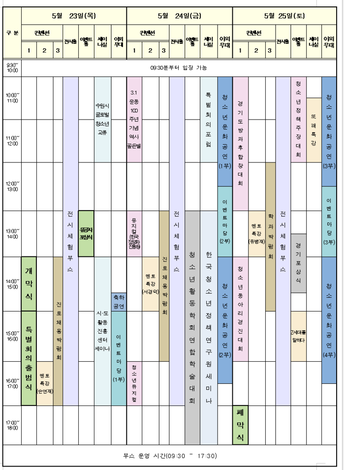 22일 오후 6시 30분 수원컨벤션센터 열린광장에서 전야제를 열고, 23일 오후 2시 컨벤션홀에서 막을 올린다. 개막식은 진선미 여성가족부장관 개회사, 염태영 수원시장 환영사로 시작해 ‘청소년 미래 선언’ 발표, 축하 공연으로 이어진다.