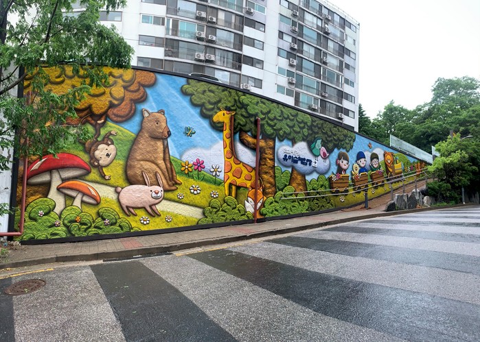 해당 외벽에는 ‘숲속 동물친구들과 아이들’을 주제로 기린, 곰 등 동물들과 기차를 타고 있는 아이들을 그려 넣어 귀여운 분위기를 조성했고, 초원과 나무, 꽃들을 더해 산뜻함도 입혔다.