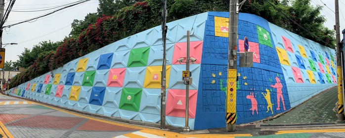 특히 이번 작업은 페인트벽화로 진행할 경우 누수 등 기존 문제가 반복되며 미관을 해칠 수 있는 점을 고려, 시트형식의 벽화로 진행했다. 또한 방수시트와 디자인시트를 붙이는 특허공법을 활용하여 내구성과 심미성도 함께 구현했다.