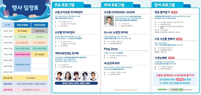 이 밖에도 ▲수산물 쿠킹쇼 ▲시장노래방 ▲수산물 퀴즈쇼 등 일반 관람객을 위한 다양한 프로그램을 통해 큰 즐거움을 선사할 예정이다.