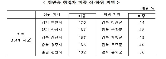 계층별 고용률은 청년층(15~29세) 42.0%, 여성층 46.8%, 중장년층(50~64세) 68.4%로 전년 같은 기간보다 청년은 1.0%P, 여성은 2.6%P, 중장년은 3.7%P 상승했다. 전체 취업자 중 청년층이 차지하는 비율은 17.0%로 전국 시·군 중 가장 높았다.