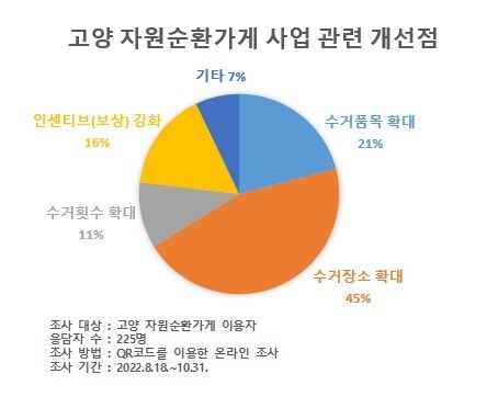 운영만족도 조사 결과 고양 자원순환 가게의 개선할 점에 대해서는 ▲수거 장소 확대(45.3%) ▲수거 품목 확대(20.9%) ▲인센티브(보상) 강화(16.0%) ▲수거 횟수 확대(10.7%) ▲기타(7.1%) 순이어서 더 많은 장소에서 자원순환 가게를 운영해달라는 의견이 많았다.