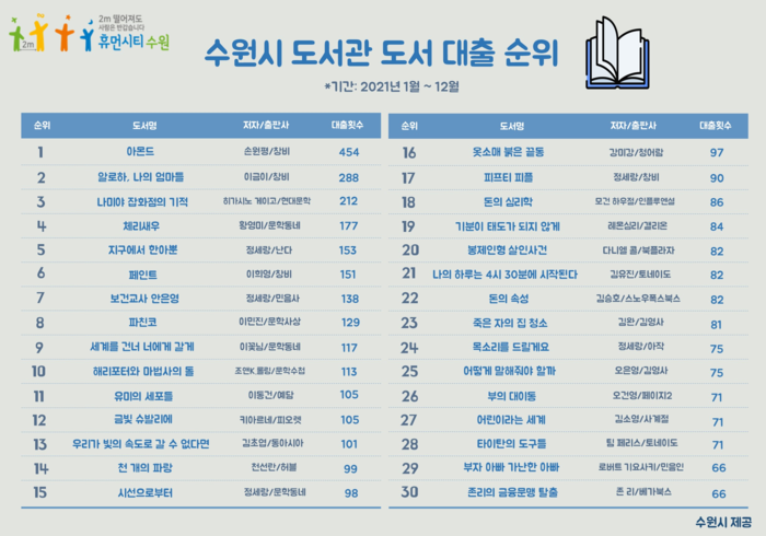 [로컬세계 김병민 기자]2021년 한 해 동안 수원시민이 수원시 공공도서관에서 가장 많이 빌린 책은 소설 '아몬드'인 것으로 나타났다.