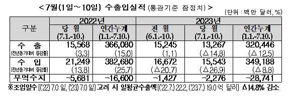 관세청은 7월 1~10일 기간 수출이 133억 달러로 작년 같은 기간보다 △14.8%(23억 달러↓) 줄었다고 11일 밝혔다. 수입도 155억 달러로 전년 동기 대비 수입 △26.9%(57억1000만 달러↓) 줄었다.